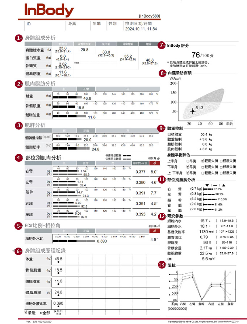 可根據需求自訂,包含的參數有基礎代謝率、腰臀圍比、骨骼肌質量指數(SMI)、體細胞量等(可以客製化)